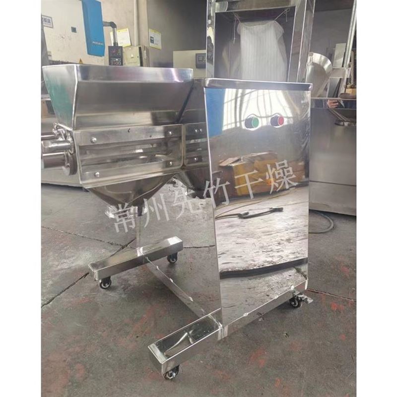 4、顆粒制造裝置:旋轉(zhuǎn)滾筒橫臥置在粉斗的下面,前后有軸承支座,它通過齒條的傳動,作倒順回轉(zhuǎn),端面的前軸承蓋為活動式,裝拆時,只要旋下一個翼形螺母,軸承蓋和旋轉(zhuǎn)滾筒即可抽出,放置滾筒的兩端制有凸形的方環(huán),嵌入軸承室內(nèi),這樣可不使油污滲入粉子和不致粘結(jié)塞住。